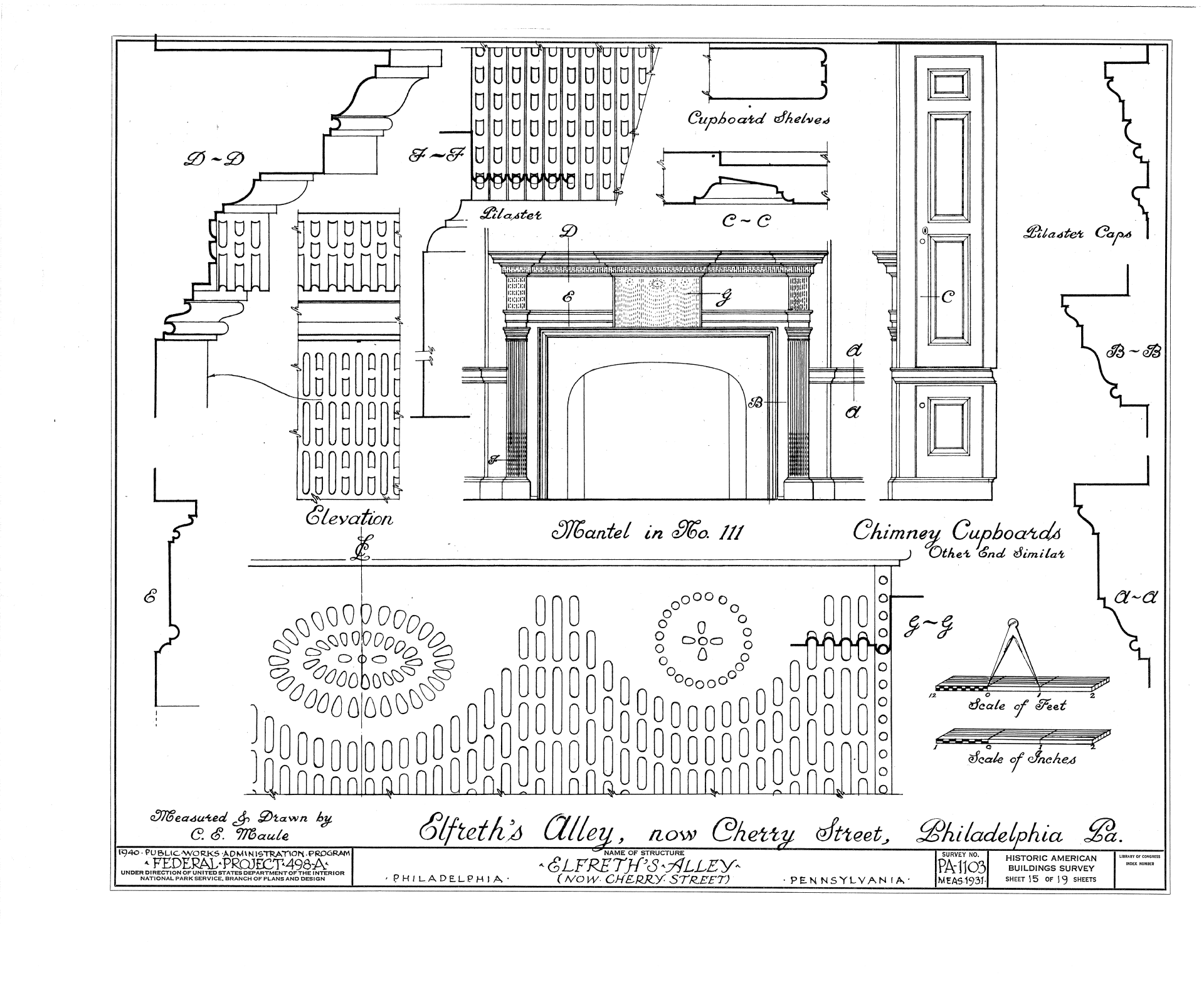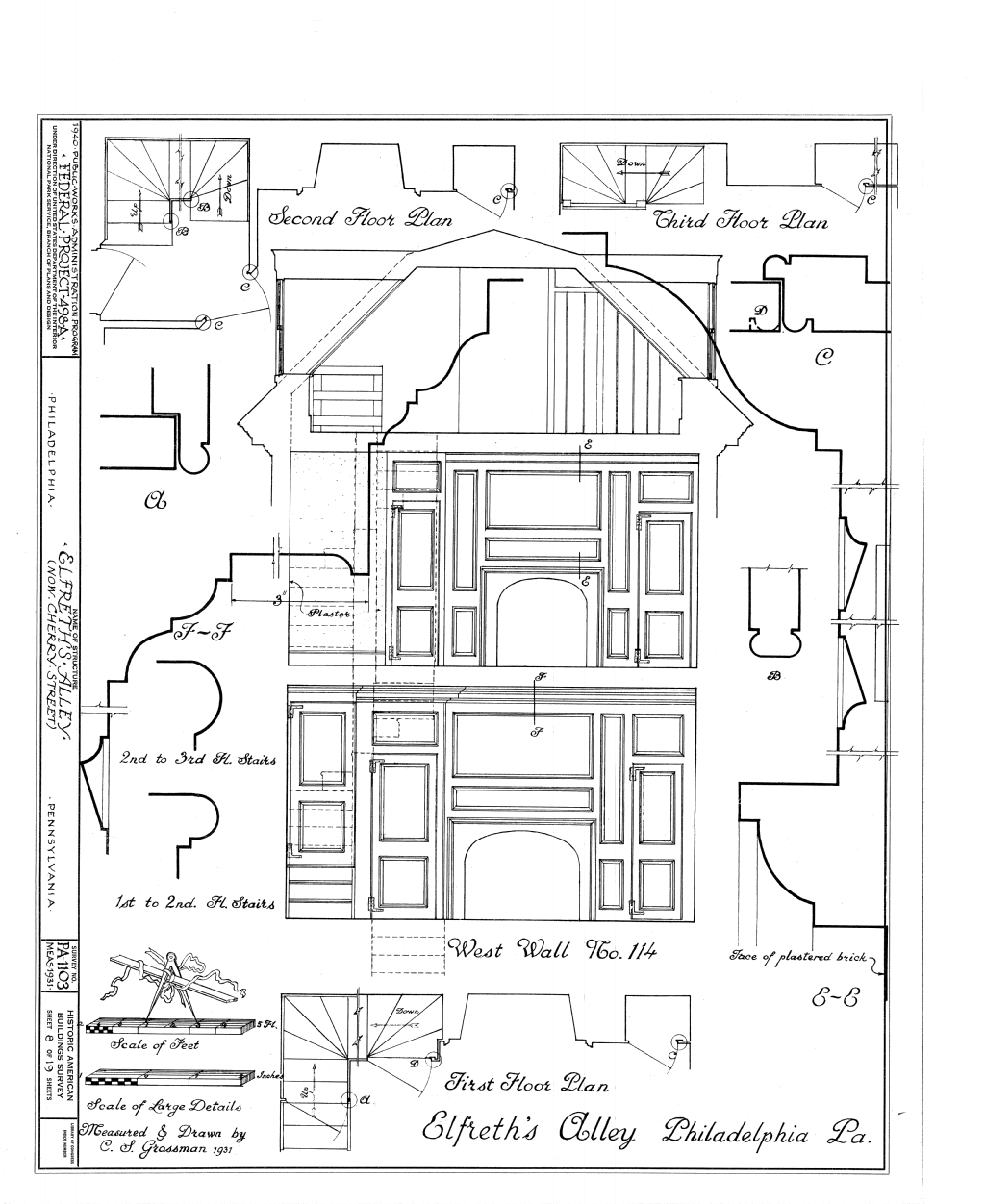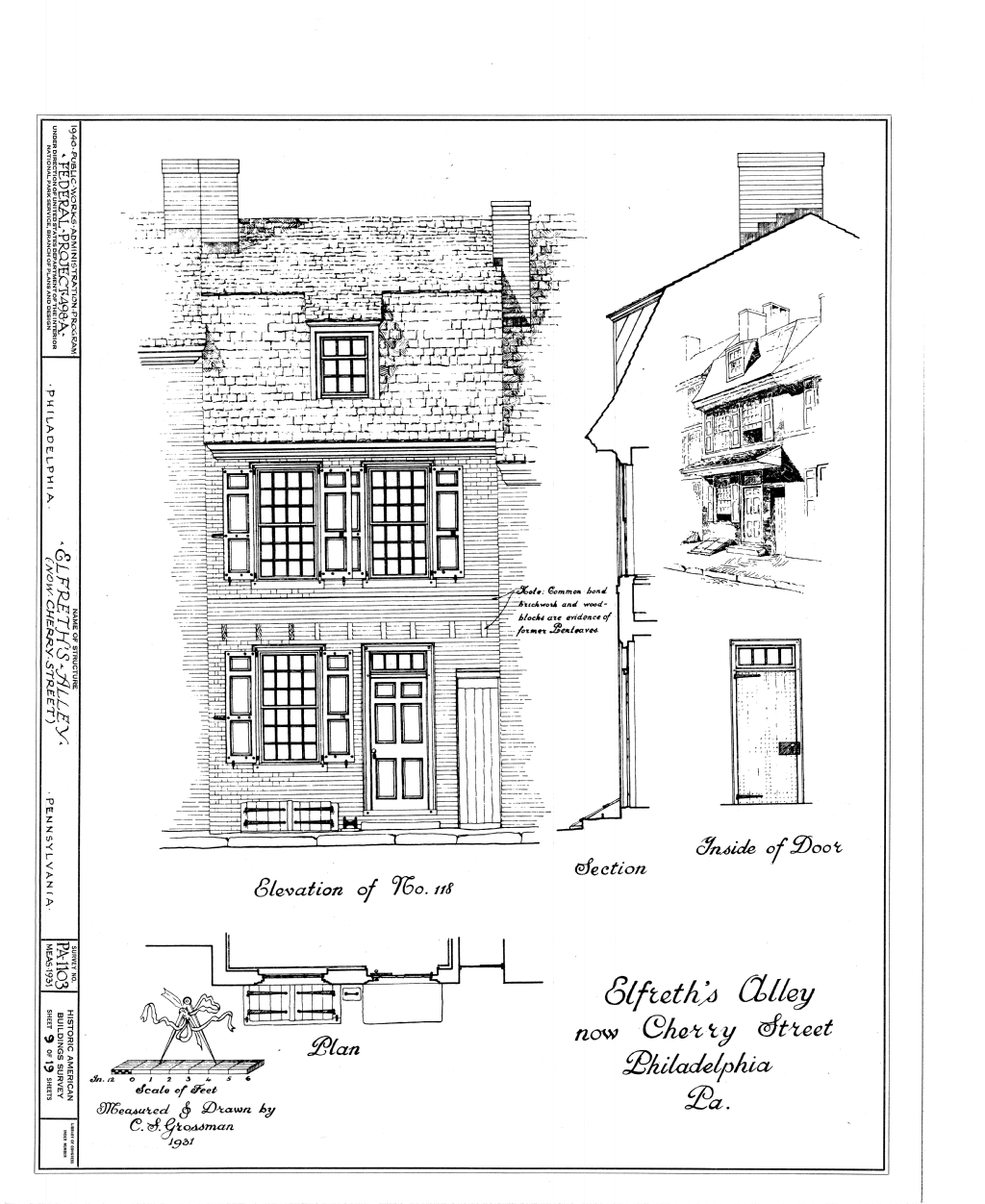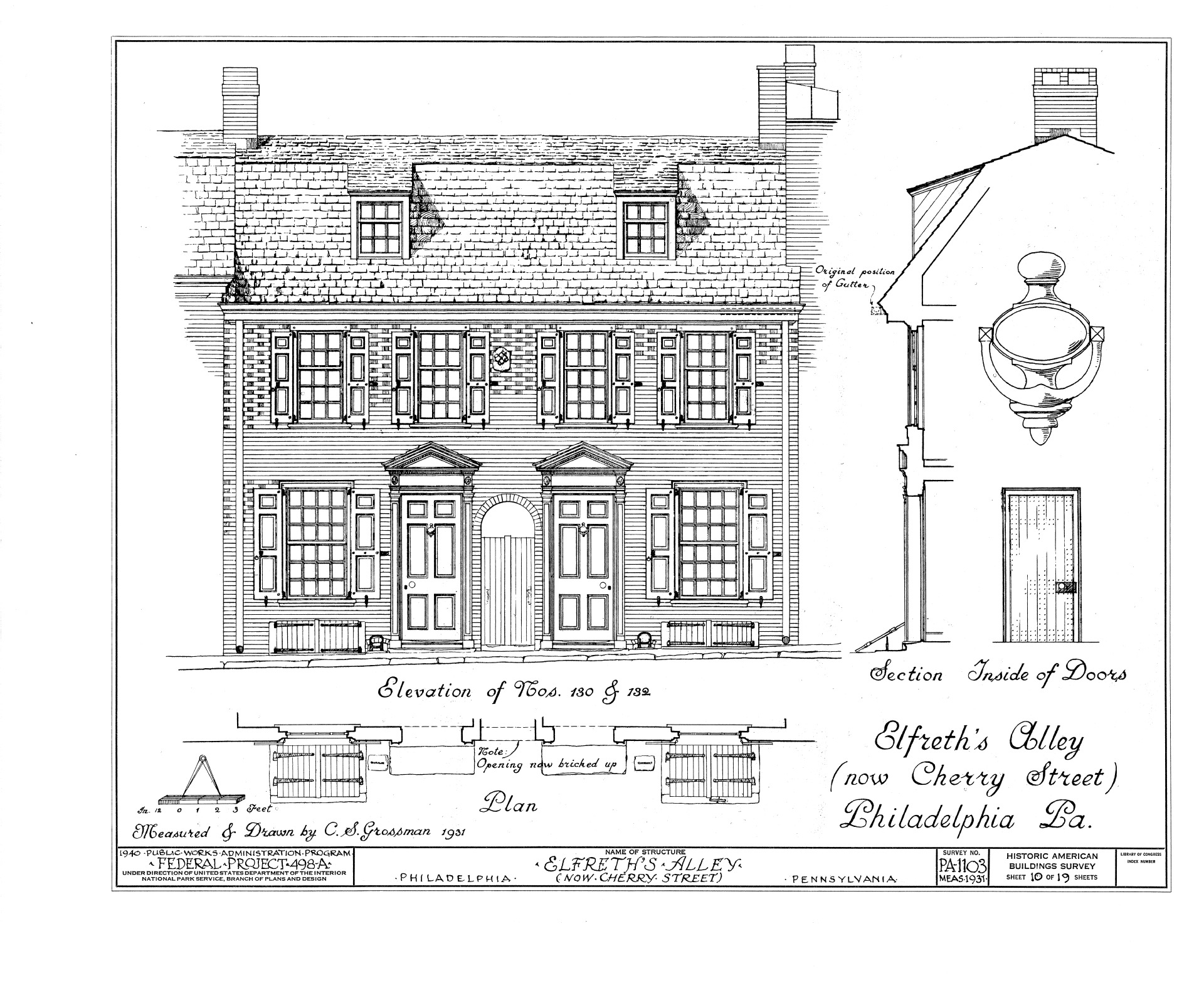Elfreth’s Alley was not included in original plans for Philadelphia. As Philadelphia became a bustling city, artisans and merchants purchased or rented property close to the ports where goods and materials arrived. This led to overcrowding, and landowners recognized that tradesmen needed alternate routes to the river. Landowners Arthur Wells and John Gilbert combined their properties between Front and Second Streets to open Elfreth’s Alley, named after silversmith Jeremiah Elfreth, as a cart path in 1706.